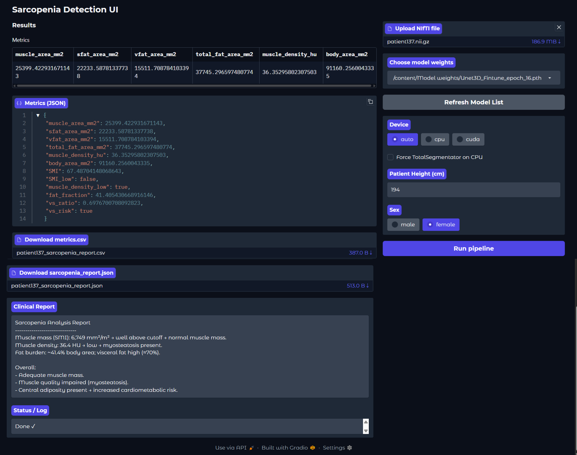 This project presents a deep learning based pipeline for automatic sarcopenia assessment using abdominal CT scans. The system identifies the L3 vertebra slice, segments key body composition structures, and computes clinically relevant metrics used for sarcopenia screening.